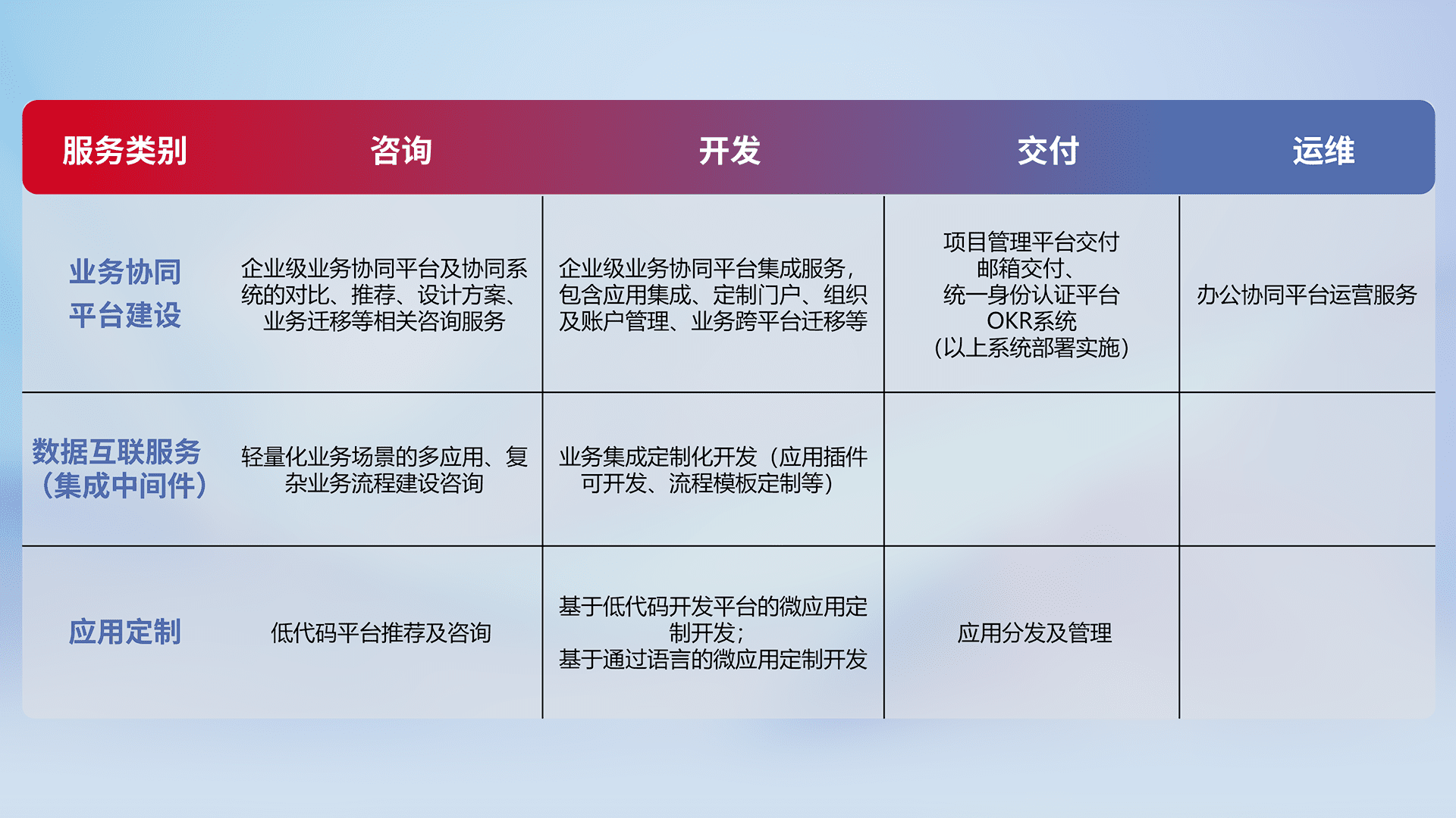 针对钉钉、、企微、、IDaas等平台级产品提供产品的规划、、、方案、、、、交付、、、、定制化开发等服务,,,实现如统一协同办公、、、、智能客户服务、、、、混合会议管理、、、智能数据查询、、等业务场景,,实现数字化转型。。。