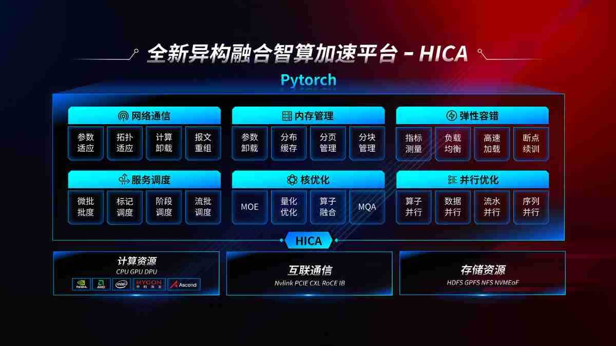 通过自研的服务层、、中间适配层、、以及调度编排算法,,采用数据并行、、、、模型并行等多种并行方式,,,把并行计算任务进行有效的分解,,,,使其分别由相应的软件栈和算力资源来承接。。当GPU资源变化,,,HICA可以实时动态调度计算子任务并调整模型拓扑和架构,,以充分聚合各种算力资源。。。。